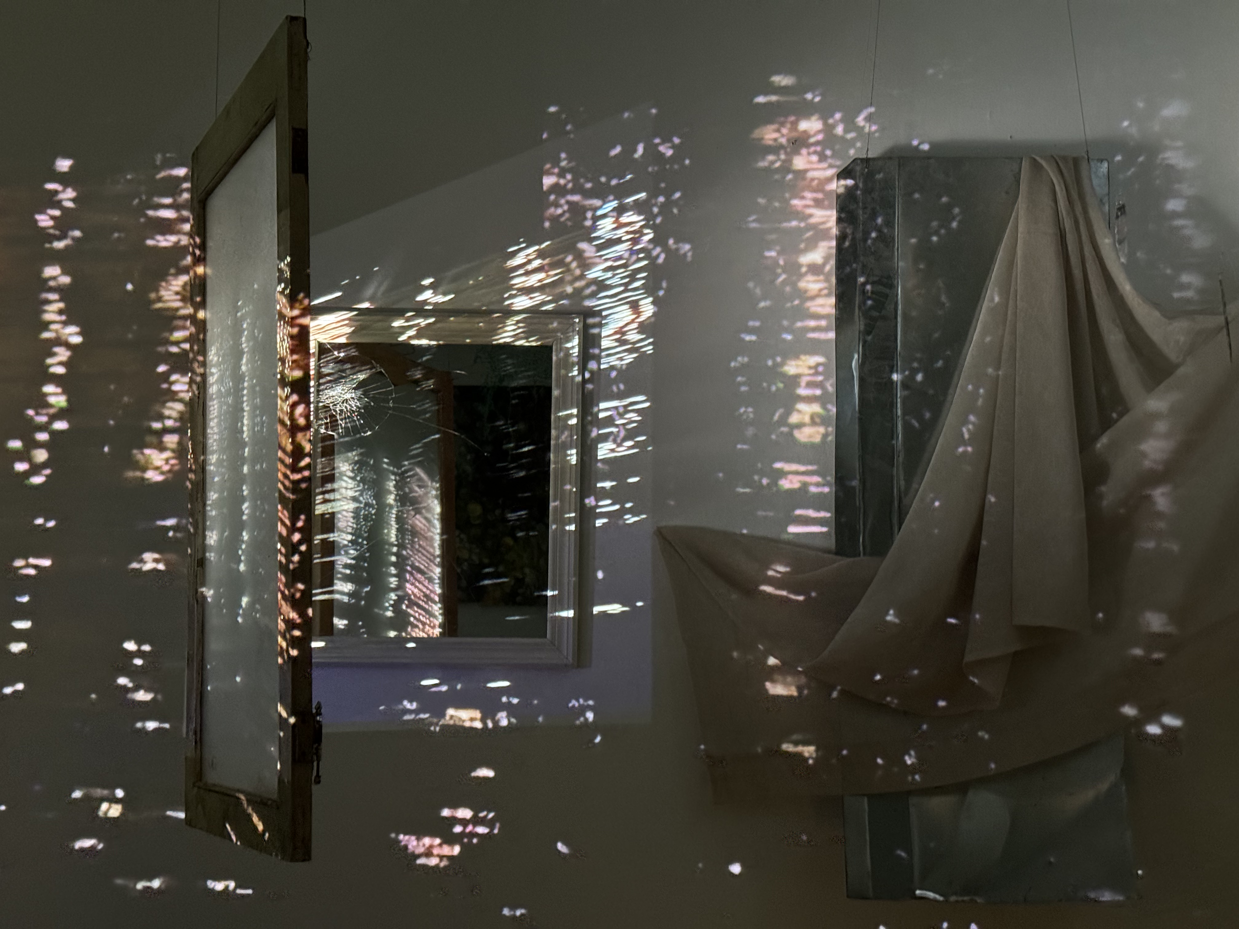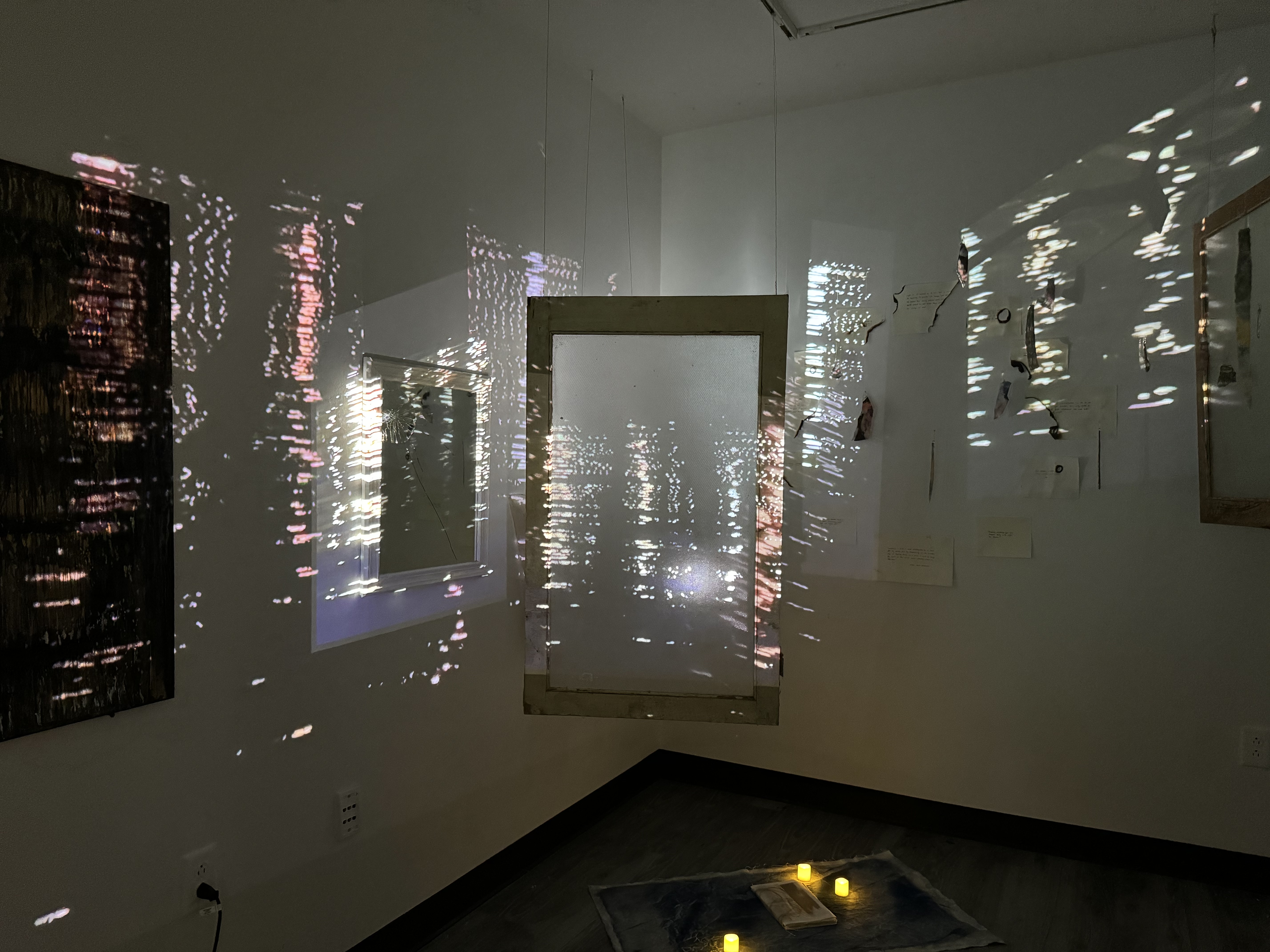multimedia installation with two video projections onto mirrors, windows, photo transfer onto glass shards, metal, fabric, and burnt paper scraps; cyanotype on canvas; an oil painting on wood; a book with risograph, photo transfers on canvas, and burnt paper